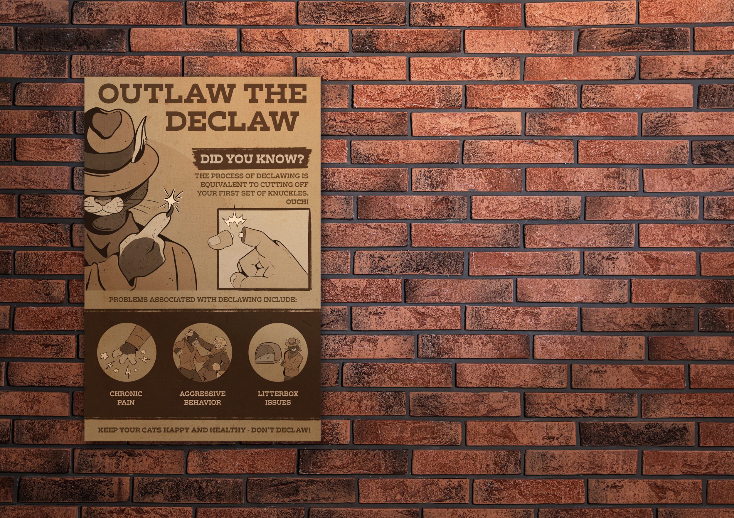 A redo of a poster design to educate the public about the consequences of declawing - the practice of removing a cat’s claws via surgery. The poster’s aesthetic is anchored to it’s central phrase: “Outlaw the Declaw” and as such is designed to mimic an old western wanted poster.
